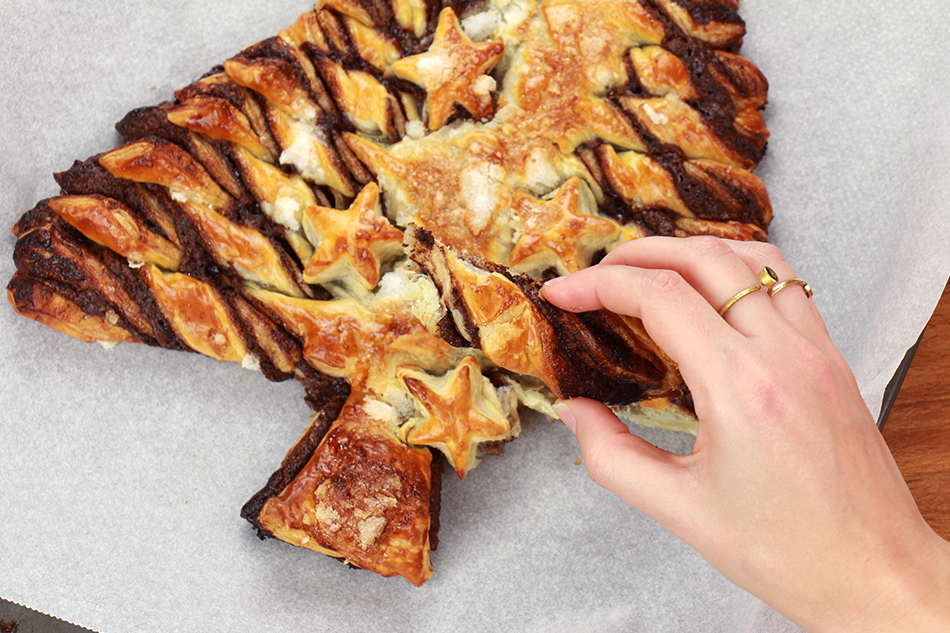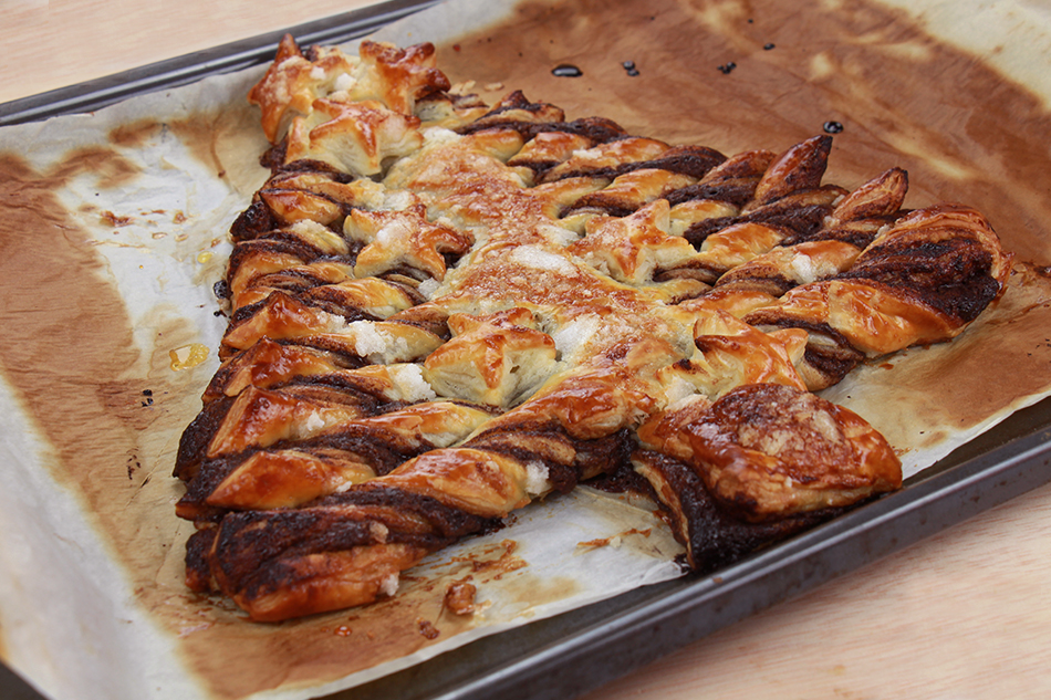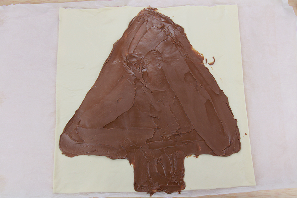 Estiraremos la primera masa de hojaldre y encima dibujaremos un árbol con la crema de chocolate. No hace falta que sea perfecto, ya que después lo recortaremos.