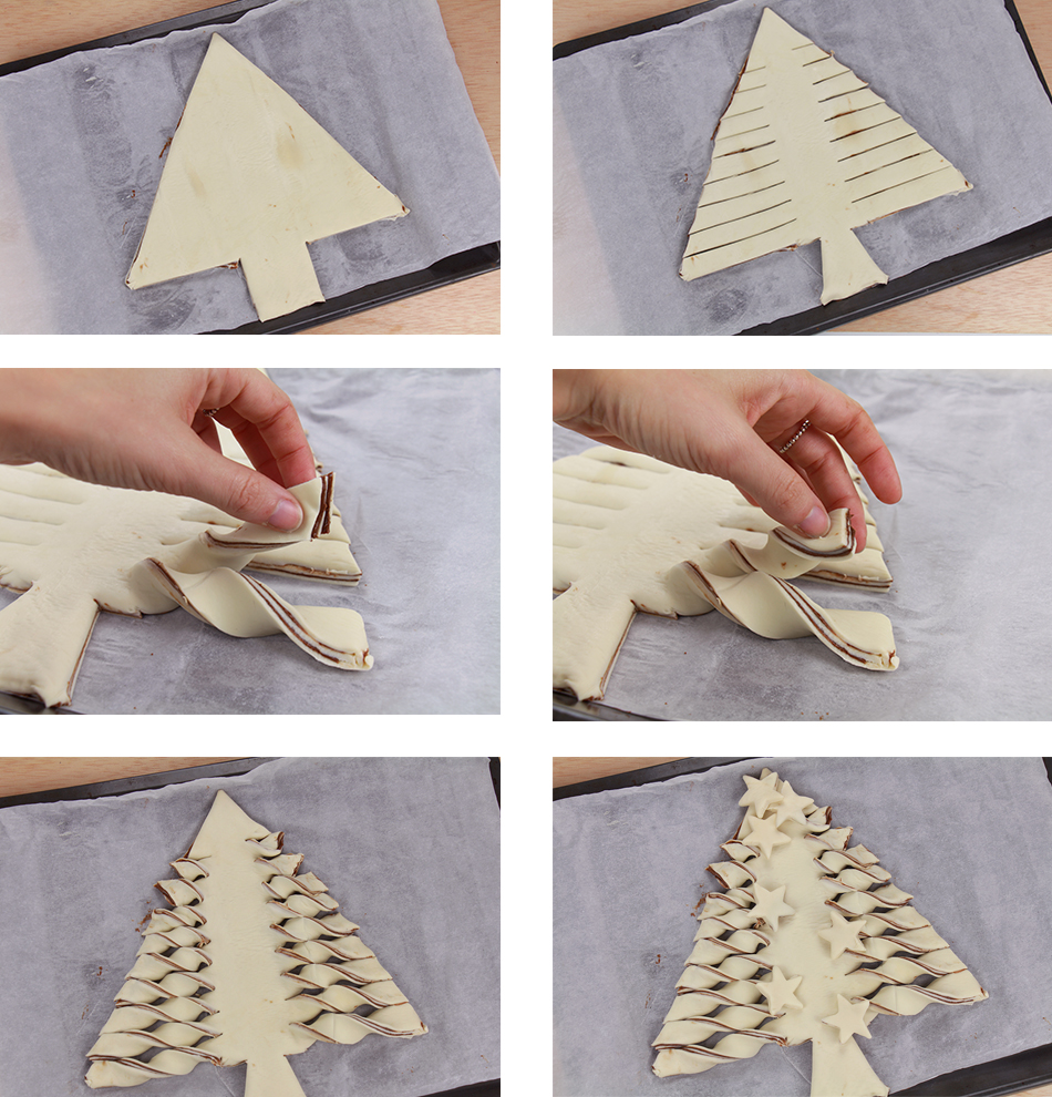 Colocaremos la segunda masa de hojaldre encima y repetiremos el proceso, intentando que este segundo árbol quede justo encima del primero que hicimos. Después tapamos con la tercera lámina que teníamos reservada. Lo colocaremos todo sobre una bandeja de horno.