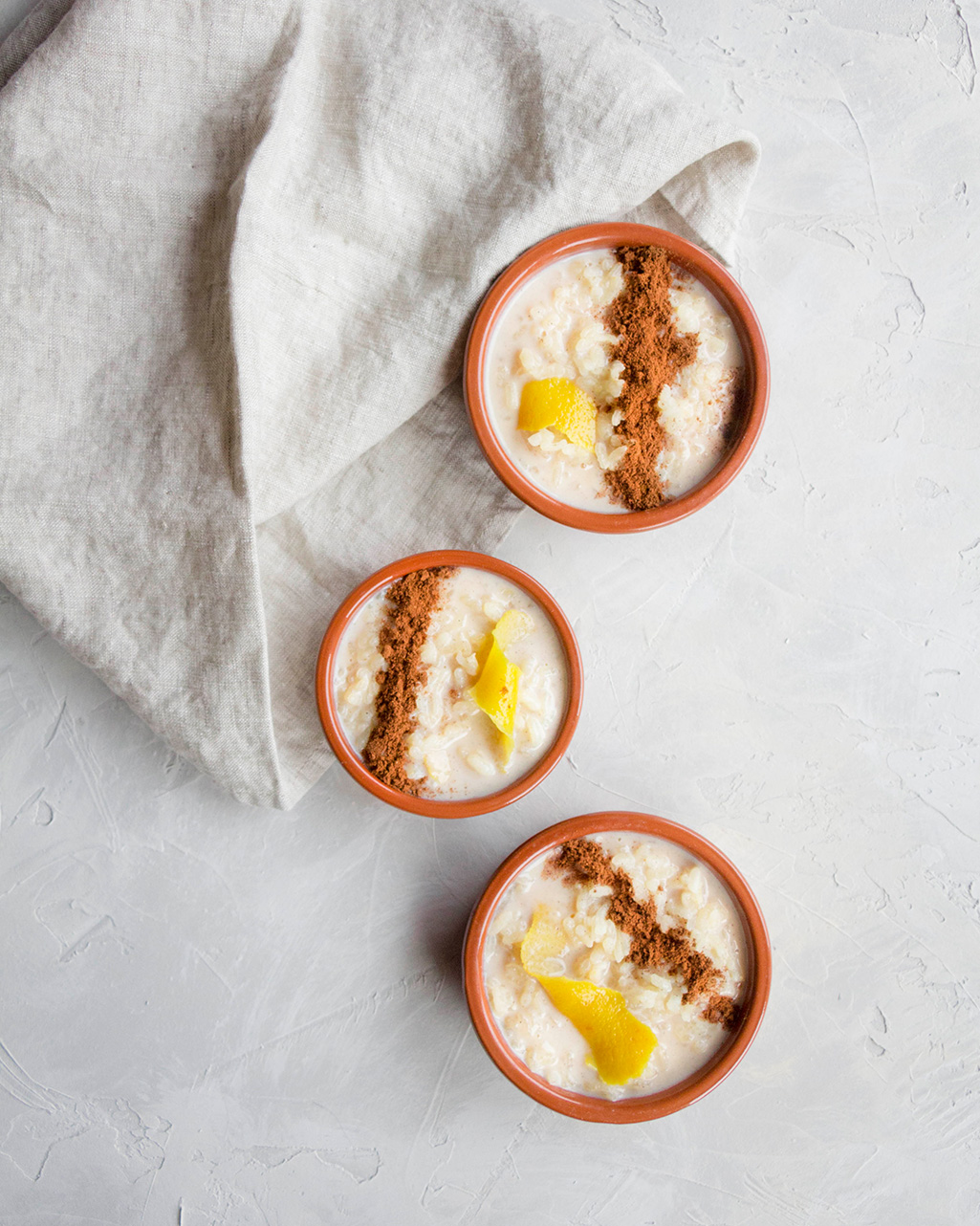 Una vez haya reposado, serviremos el arroz en una fuente o en vasitos individuales. Podéis escoger si dejar las ramas de canela y la piel del limón o retirarlo. A mí me encanta saborear y rechupetear las cáscaras y las ramas, así que no las retiro antes de servirlo, pero si lo preferís podéis quitarlas.