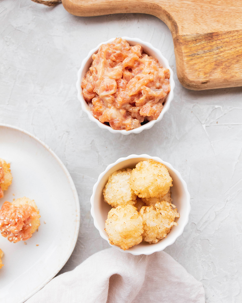 Os cuento que freír el arroz es opcional, lo podríais usar tal cual estilo sushi, pero el punto del crujiente creo que le da un puntazo muy chulo. Otra sustitución que podéis hacer es con el pescado. El salmón en casa nos encanta, por eso hemos optado por este pescado, pero con atún o lubina también quedaría genial. Podéis añadirle otros ingredientes como atún o queso crema, pero así sencillo está increíble.