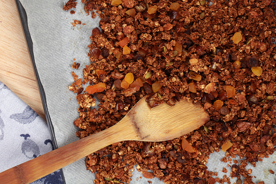 Forraremos una bandeja para horno con papel vegetal y distribuimos por toda la superficie la mezcla anterior, de manera que no tengamos una masa muy gorda o irregular. Lo llevaremos al horno durante unos 25 min, removiendo cada 10 min para que no le llegue el calor solo por un lado y se queme o apelmace. Cuando veamos que está bien dorada y tostada, la retiraremos del horno y la dejaremos enfriar sobre la misma bandeja. Aunque a priori parezca que está blandita, veréis como poco a poco va endureciendo y se va poniendo crujiente. Cuando la mezcla haya enfriado por completo, cortaremos en pequeños trocitos las frutas secas que hayamos elegido y las agregaremos a la granola, asegurándonos que lo repartimos bien por toda la masa. Después lo guardaremos en un bote hermético, donde podremos mantenerlo hasta 2 semanas.