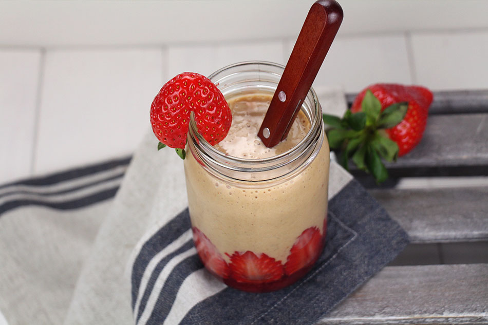 1 plátano congelado cortado a rodajas – 4 dátiles – 8-10 fresas para caramelizar + decoración – 150 ml leche de almendra o avena – 1 cda de mantequilla de avellanas o almendra casera (más arriba te cuento como prepararla) – 1 cdita canela – 1/2 cdita panela – 1 cdita sirope de agave – granola casera