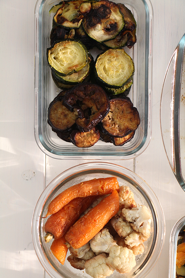 A continuación os listo las elaboraciones previas y que sí o sí debemos hacer el día del Batch Cooking. Yo intento unificarlo por bandejas, intentando hornear lo máximo posible a la vez para optimizar el horno. En mi caso tenía una bandeja con las verduras a rodajas, otra con las verduras troceadas, otra con la calabaza y el boniato y otra con la verdura entera. Como me cabían solo 4, fui sacando bandejas a medida que estaban cocinadas (algunas tardan más que otras) y en paralelo aproveché para preparar unas galletas de zanahoria que os dejo aquí y aprovechar el horno caliente.