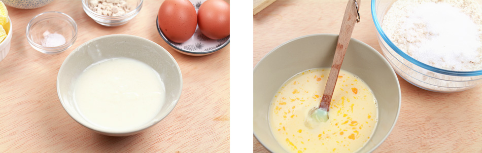 En otro bol vertemos todo el tan zhong, con la leche y los huevos. Lo removemos bien con unas varillas y lo agregamos al bol anterior.