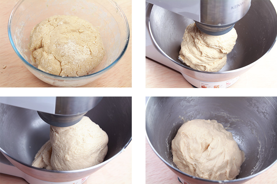 Empezamos mezclando y amasando con una espátula de madera y cuando ya no podamos seguir lo amasamos con las manos hasta que se integre todo bien. Finalmente formaremos una bola. La dejaremos reposar 20 minutos.