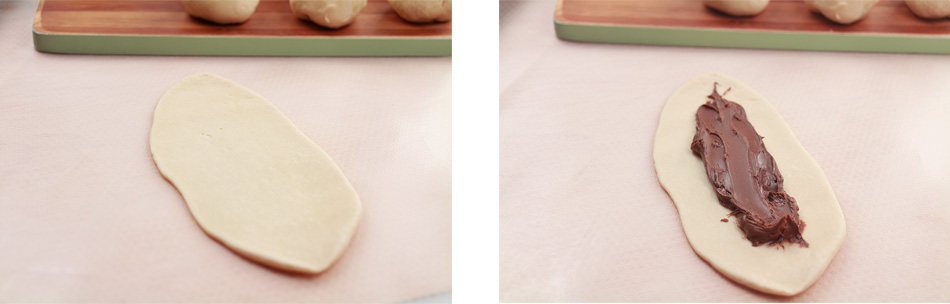 En el centro de cada masa ponemos de forma alargada la Nutella, sin llegar a los bordes para que no se salga durante el horneado.
