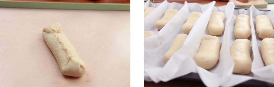 Con la masa hacemos bolas de 65 gr, para que salgan aproximadamente unas 14. Cada una la estiraremos con un rodillo a lo largo, para que quede más estrecha pero más alargada, en forma de Bollicao.