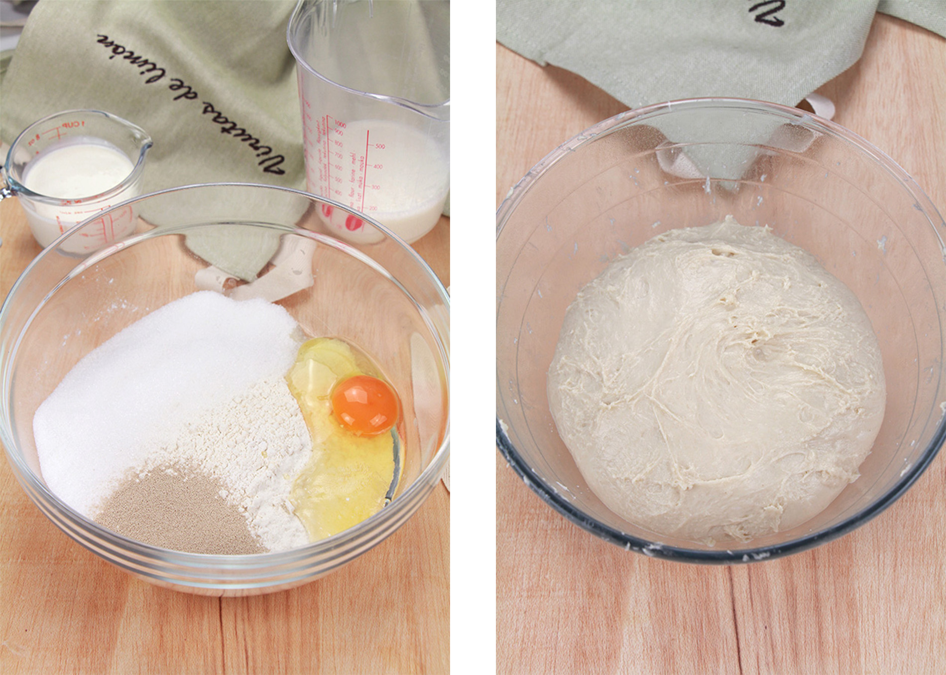 Empezaremos mezclando en un bol grande la leche, la nata, la panela, las dos harinas, la levadura seca y la sal. Removeremos bien con una cuchara o una espátula para empezar a integrar y cuando no podamos seguir, trabajaremos la masa a mano o con un robot amasador hasta llegar al punto de membrana. Como os he contado en otras recetas, se trata de estirar un poco de masa y ver como se forma como una película fina, una membrana. Con una amasadora tardaréis unos 12-15 min, a mano quizás un poco más. Cuando se os empiece a despegar del bol y no se pegue tanto a las manos, la tendréis lista.