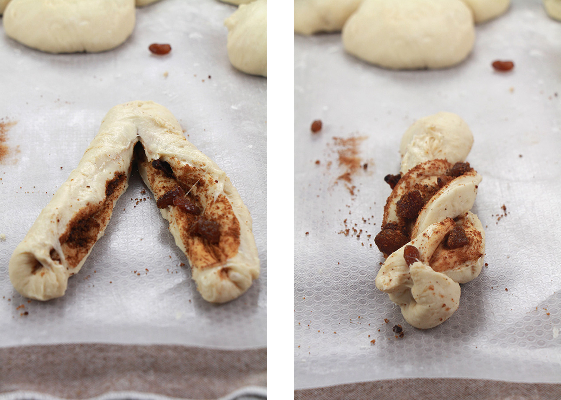 Cuando tengamos nuestro relleno, enrollaremos la parte alargada de nuestro bollo sobre si misma, sellando la unión con unos pellizquitos para evitar que se abra durante el horneado. Después haremos un corte vertical, sin llegar a una de las puntas, de manera que nos quede una especie de V. Enrollaremos las dos extremidades entre sí, como entrelazándolas. Cuando lleguemos al final, enrollaremos el bollo sobre sí mismo como una caracola o una espiral.