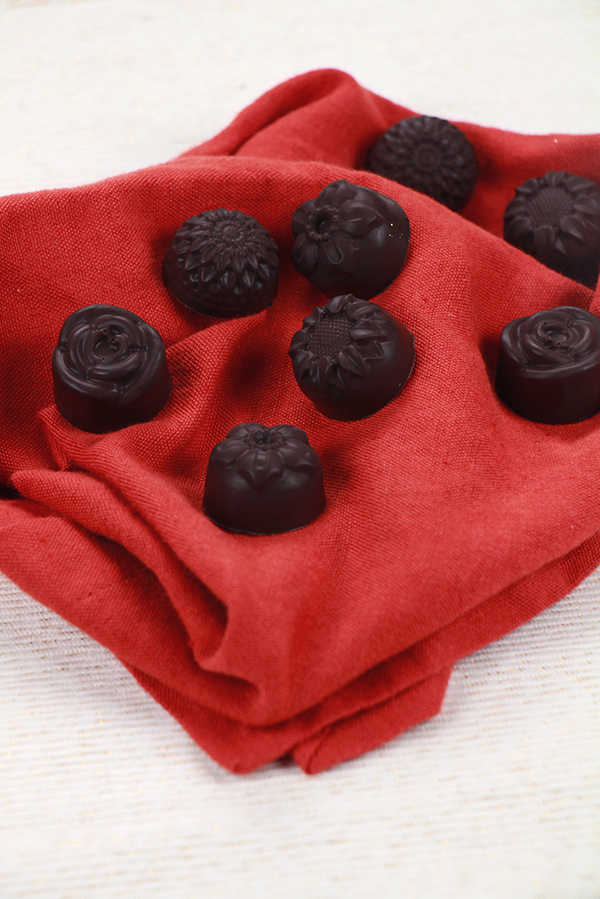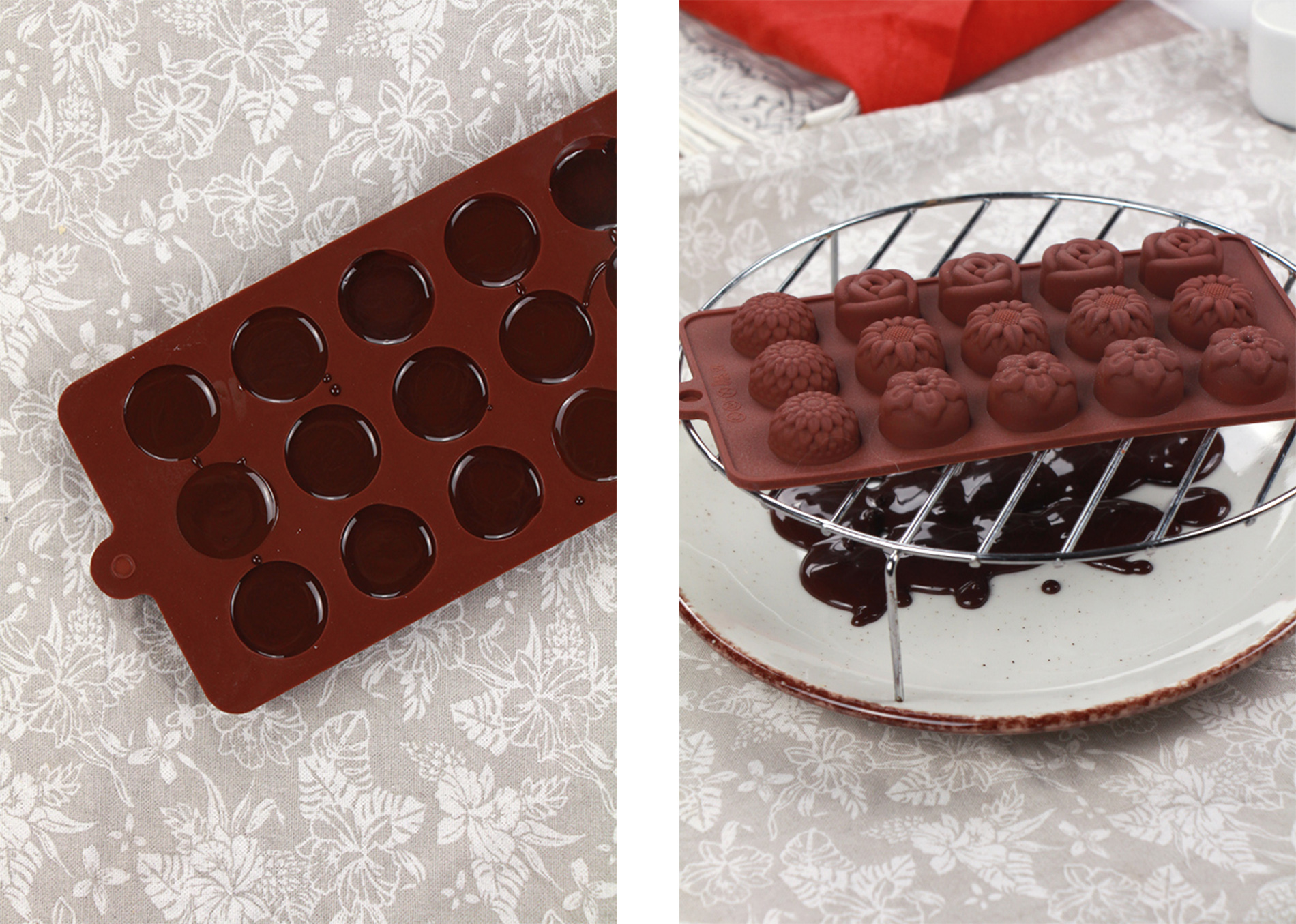 Os recomiendo usar un chocolate de calidad, pues el resultado que se consigue es mucho mejor. Yo utilicé uno de cobertura, que aunque quizás no es el más adecuado, es muy buen chocolate para conseguir un resultado súper. Podéis utilizar mini capsulitas para bombones como estas o, si los queremos desmoldar, hacerlos en moldes de silicona o policarbonato.
