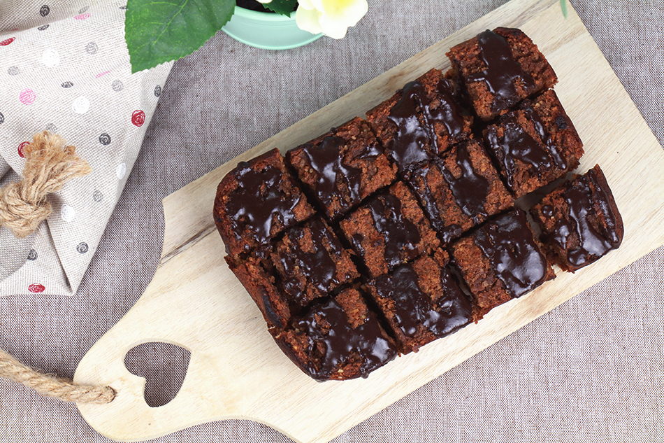 Para servirlo, lo podemos cortar en trocitos pequeñitos (ya que es muy denso y llena) e incluso rociarle un poco de sirope de chocolate vegano. Lo que hice fue mezclar 2 cditas de cacao, con 1 cda de aceite de coco y 1 cda de mantequilla de cacahuete y lo esparcí por toda la superficie. ¡Le aportará el toque dulce!