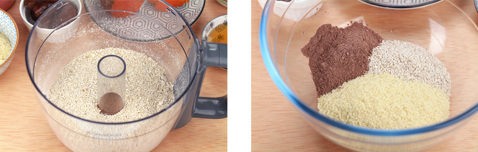 En una picadora ponemos los copos de avena, que vamos a triturar hasta que queden como polvo, como harina. Lo llevamos a un bol grande y lo mezclamos con las almendras molidas (también las podemos picar con la picadora) y el cacao, removiendo para que se integre todo bien.
