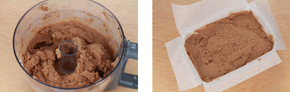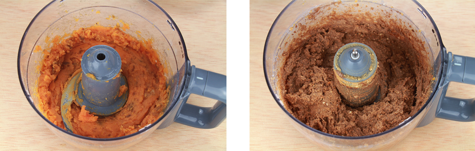Vertemos en la picador los dátiles (si son con hueso, hay que deshuesarlos antes) y el boniato ya cocido y enfriado. Lo trituraremos bien hasta que queden unos trocitos pequeños. Después añadimos el aceite de coco y el sirope de Agave y lo volvemos a triturar todo junto. A continuación agregamos la mezcla del paso 2 y volvemos a picarlo todo para que se integre.