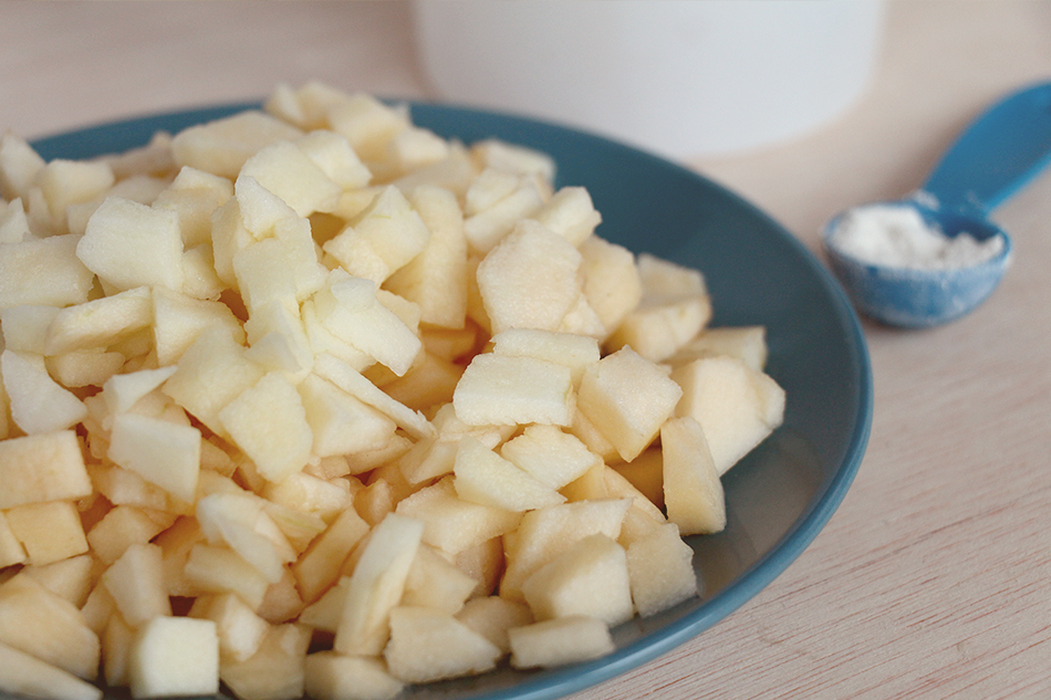 Pelamos las dos manzanas, que recomiendo que sean de una variedad dulce tipo Golden o Pink lady, y las cortamos a cuadraditos pequeños, eliminando la parte interior con las semillas.