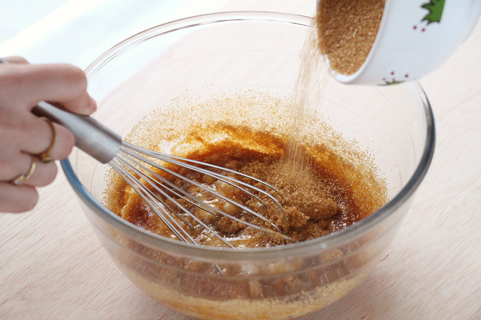 En un bol grande batimos ligeramente los huevos y añadimos el azúcar moreno. Para esta receta no es necesaria una batidora, pues no hay que mezclar mantequilla o montar nada, así que podéis utilizar un batidor manual.