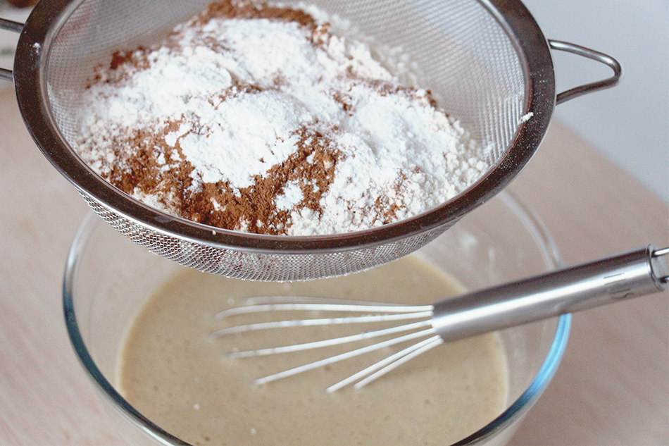 Ponemos un tamiz sobre el bol y vertemos la harina, la canela, la levadura y la sal. Mezcla con cuidado para que no salga volando la harina y poco a poco ves aplicando más velocidad para integrarlo todo bien y que nos quede una textura cremosa.