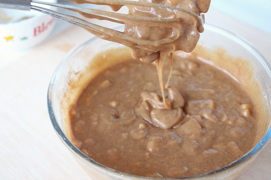 Cuando no queden rastros de harina, añadimos la manzana que teníamos reservada y lo removemos todo junto para que quede repartido por toda la masa.