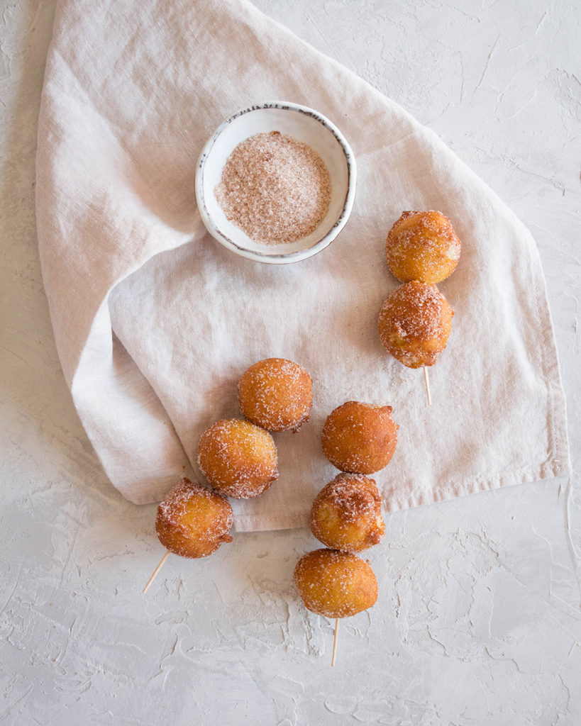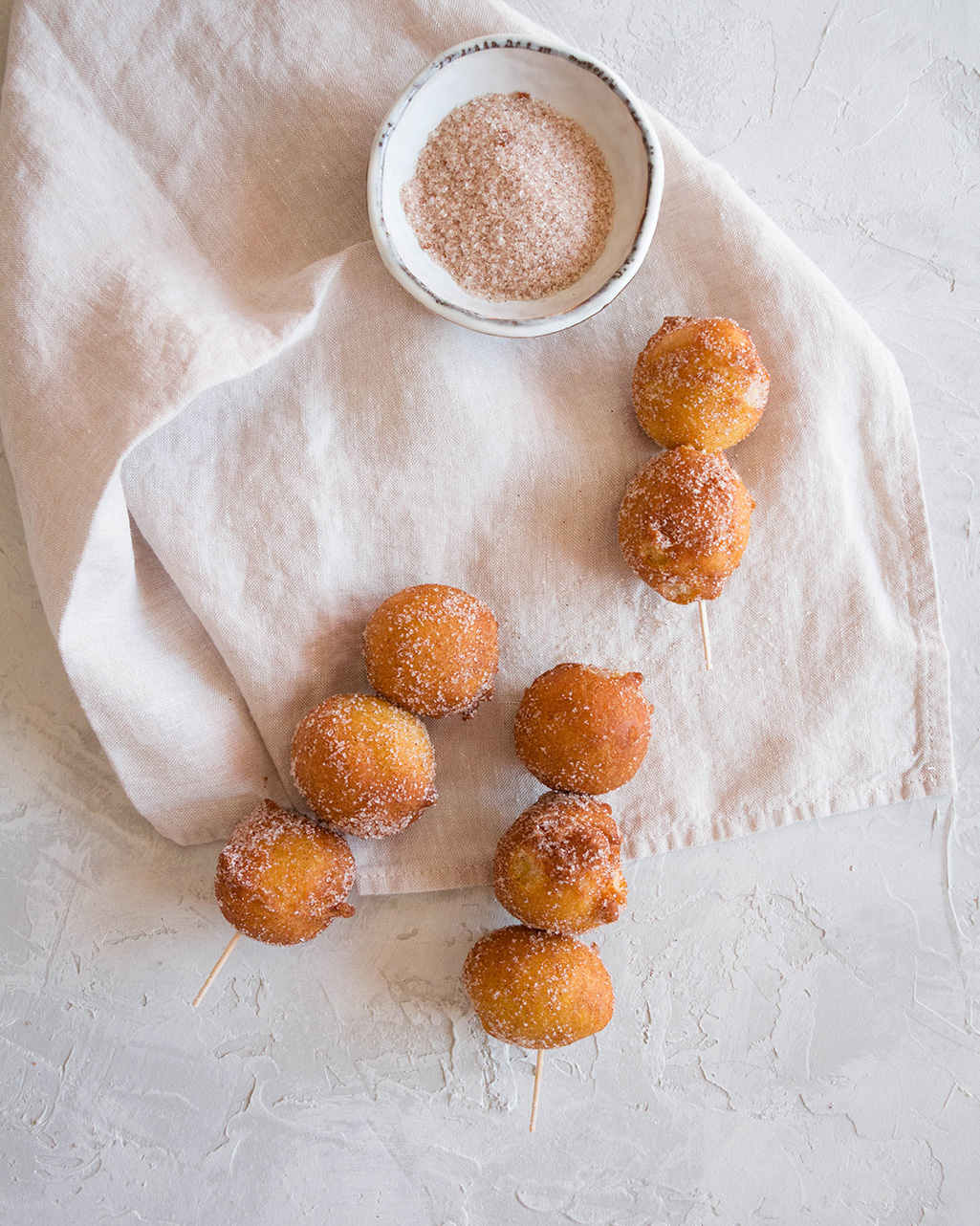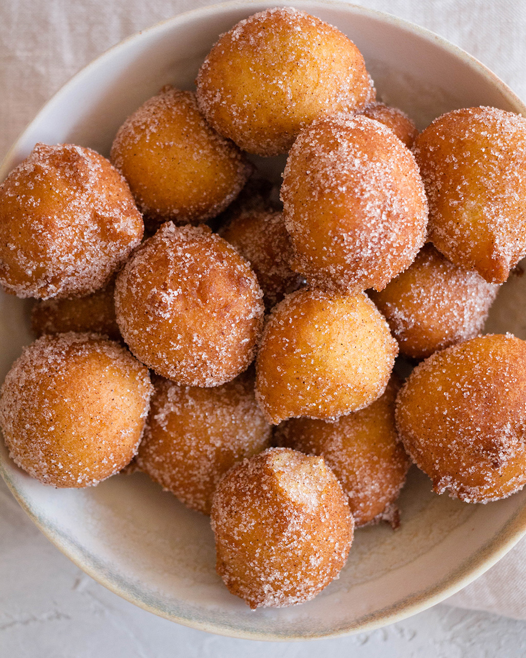 Cuando los buñuelos estén los escurriremos con la espumadera y los pasaremos a la bandeja con papel antiadherente. Los dejaremos el tiempo justo para meter más masa al aceite, pero aún calientes los tenemos que rebozar por el azúcar y canela, para que se pegue bien. Cuando estén bien rebozados los iremos traspasando a un plato o recipiente. A la hora de rebozarlos, si hay «cuernos» en el buñuelo, podemos ir retirándolos con los dedos y el azúcar cubrirá las posibles imperfecciones.