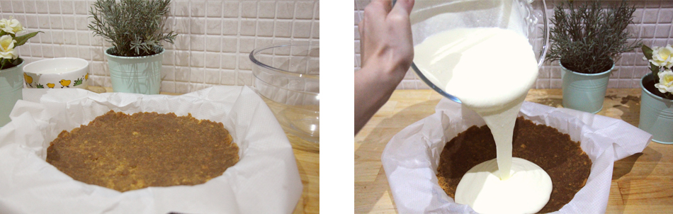 Recuperamos la base de galleta de la nevera y le vertemos la masa cremosa encima. Nos aseguramos, con la ayuda de una cuchara o lengua pastelera, que la crema está bien repartida sobre toda la superficie. Después tapamos con papel film o aluminio y lo llevamos todo a la nevera toda la noche o un mínimo de 4-6 horas.