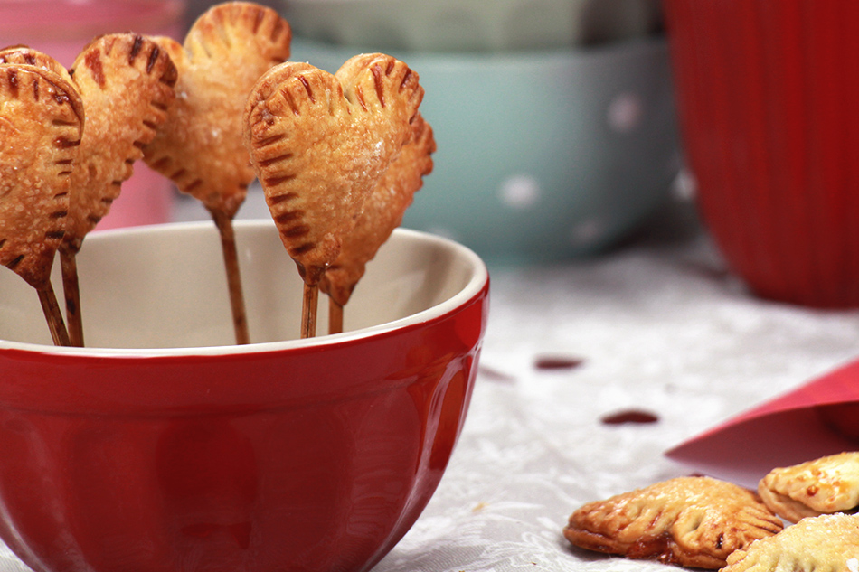 Antes de taparlos, barnizaremos ligeramente con agua y un pincel para postres, los bordes de los corazones, de esta manera cuando juntemos las dos mitades consigamos que se peguen bien. Después cubriremos los corazones con las mitades de corazones vacías que habíamos reservado y los sellaremos por alrededor con un tenedor, como si hiciéramos empanadillas.