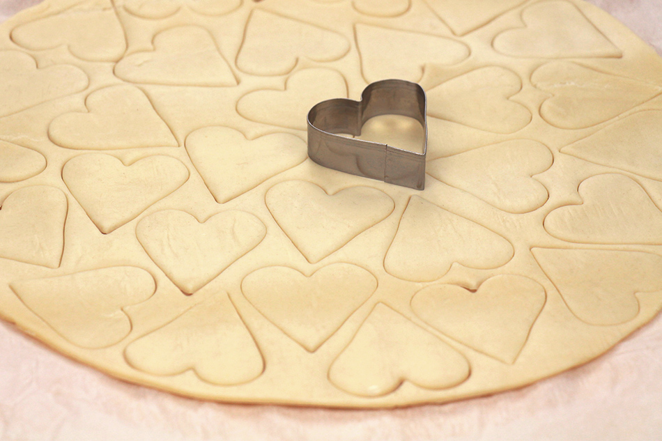 A continuación, cortaremos la masa con un molde en forma de corazón, intentando que te salgan números pares para que no se quede ningún corazón sin su cobertura. No escojáis un molde demasiado pequeño, porque no os cabrá mucho relleno y no solo os será muy difícil de cerrar, si no que se os saldrá durante el horneado y os quedarán huecos por dentro. Cuando hayamos recortado toda la masa, podemos volver a juntar las sobras y volver a estirarla para cortar nuevos corazones, pero si lo hacéis, os recomiendo que la amaséis un poco, la llevéis a la nevera para que repose unos 15-20 min y después la estiréis. Ya que si no, lo que pasará es que cuando recortéis la forma se os encogerá.