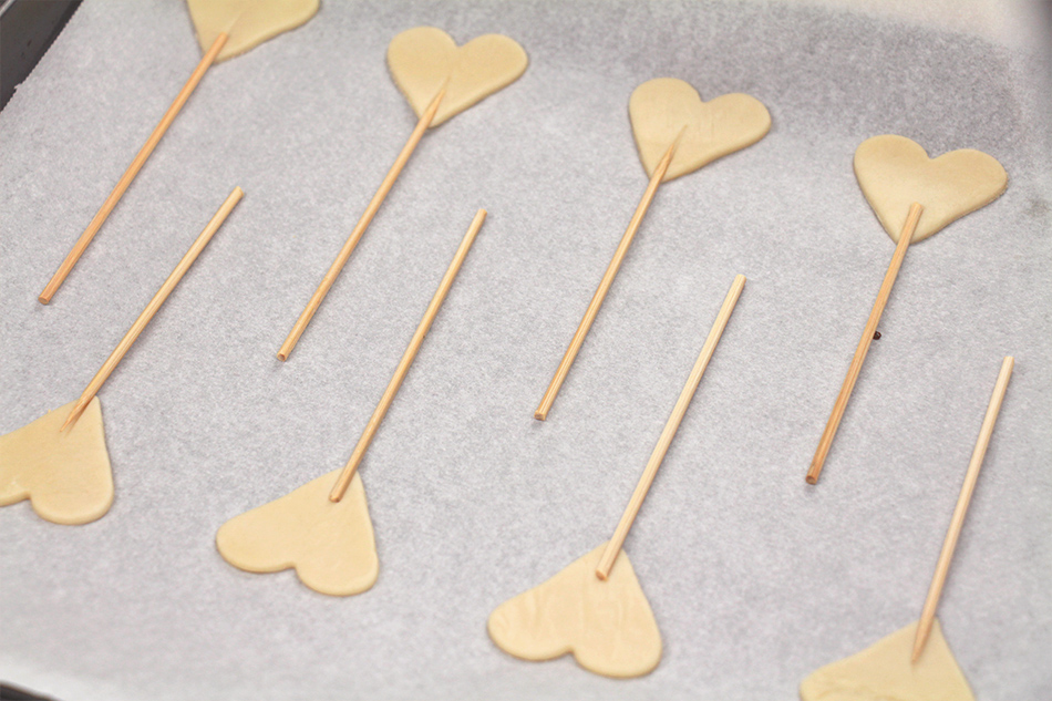 Separaremos los corazones y los iremos colocando en una bandeja de horno forrada con papel vegetal y con algo de separación entre ellos. Para aprovechar el espacio los podéis colocar en direcciones opuestas. Colocaremos solo la mitad de los corazones, las otras mitades serán las coberturas. Si no os cabe todo en una bandeja, podéis repartirlo en dos. Después colocaremos palitos de chupa-chups o de madera en el centro de cada base, sin que quede muy arriba, pero que nos pueda sujetar la «piruleta». Este punto es opcional, pues podéis simplemente cerrarlos y que queden como unos bombones o caramelos. Si optamos por la opción de palos de madera, antes deberemos mojarlos en agua para evitar que se quemen en el horno.