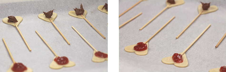 Con la ayuda de una cucharita, colocaremos el relleno en el centro de cada base de corazón, dejando espacio libre alrededor para evitar que cuando lo tapemos se escape el relleno por los laterales. Lo divertido es que tengan varios sabores y que sea una sorpresa al comerlos: en esta ocasión los rellenaremos de mermelada de fresa y chocolate, ¡pero la imaginación no tiene límites!