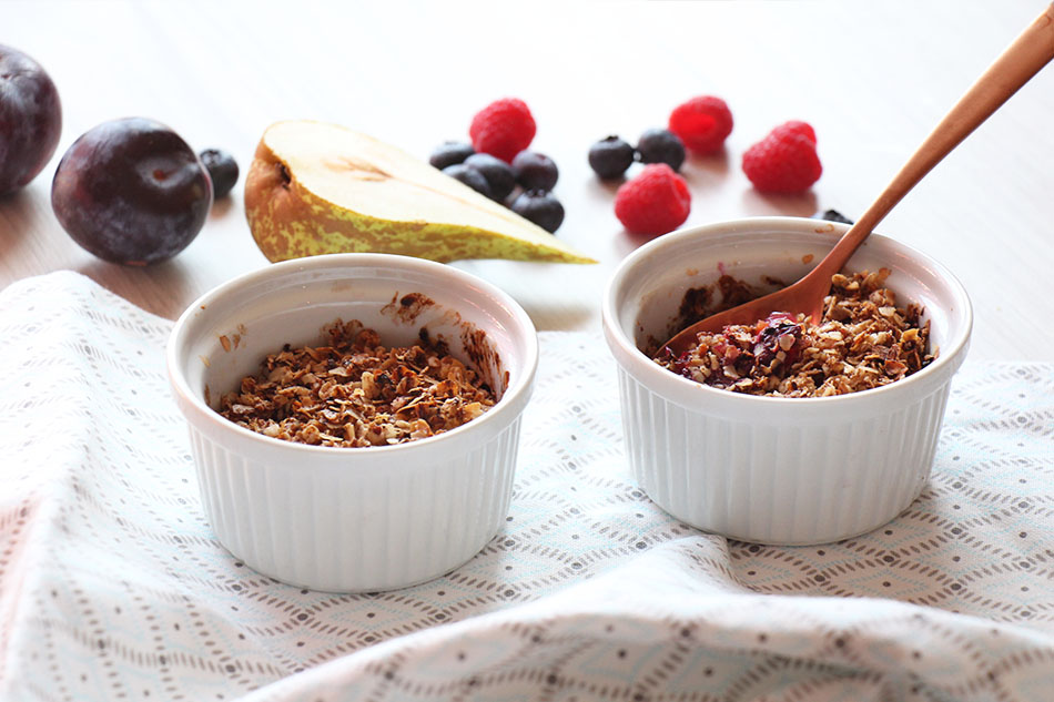Los crumbles de frutas son el desayuno o merienda perfectos para cualquier época del año, pues podemos usar cualquier tipo de fruta y adaptarlo a cada temporada. Por ejemplo, en verano usar bayas frescas, frutos rojos,… De hecho en el blog cocinamos un delicioso crumble de melocotones asados para chuparse los dedos. Pero también puede adaptarse a frutas de otoño o utilizar frutas congeladas en invierno.