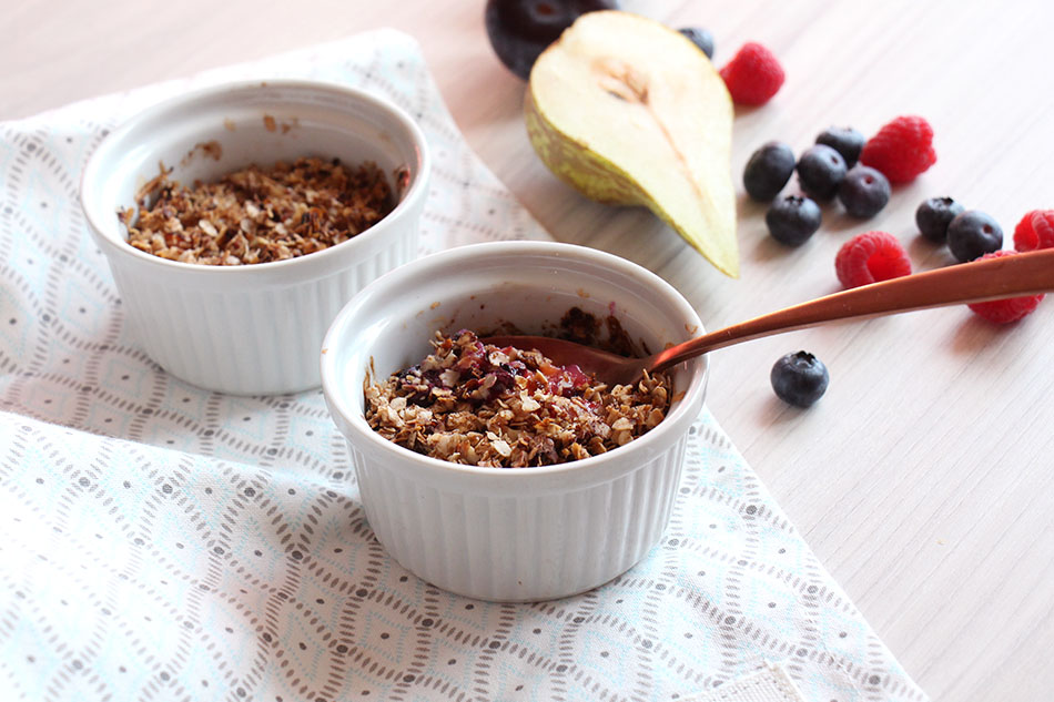 Para el crumble de hoy utilizaremos pera, arándanos, frambuesas y ciruelas. Pero podéis usar las frutas que más os gusten: caqui, granada, kiwi, mango, manzana, naranja, plátano, uva,… Aquí os dejo una idea con manzana, que como veis preparamos de forma diferentes a la versión de melocotón, para la que previamente preparamos una granola casera.
