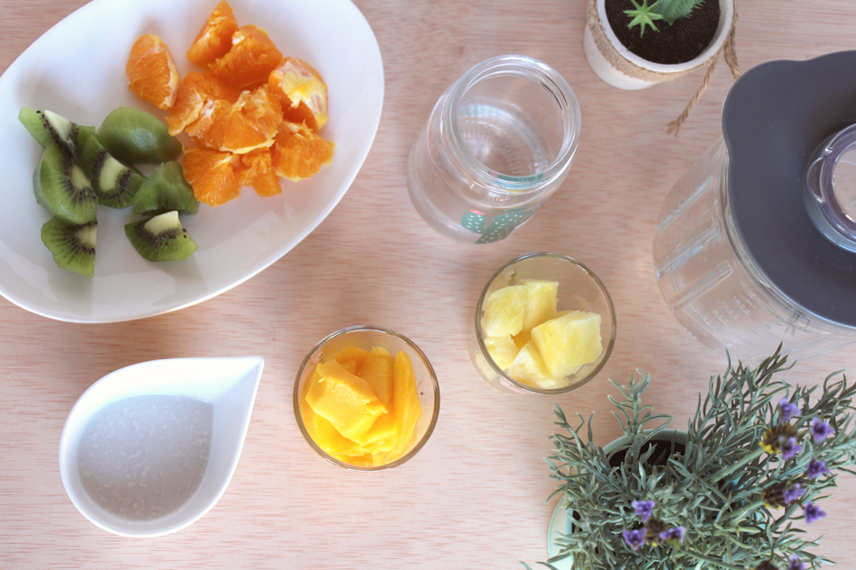Cortar todas las frutas (o coger la bolsita del congelador) y medir los líquidos.