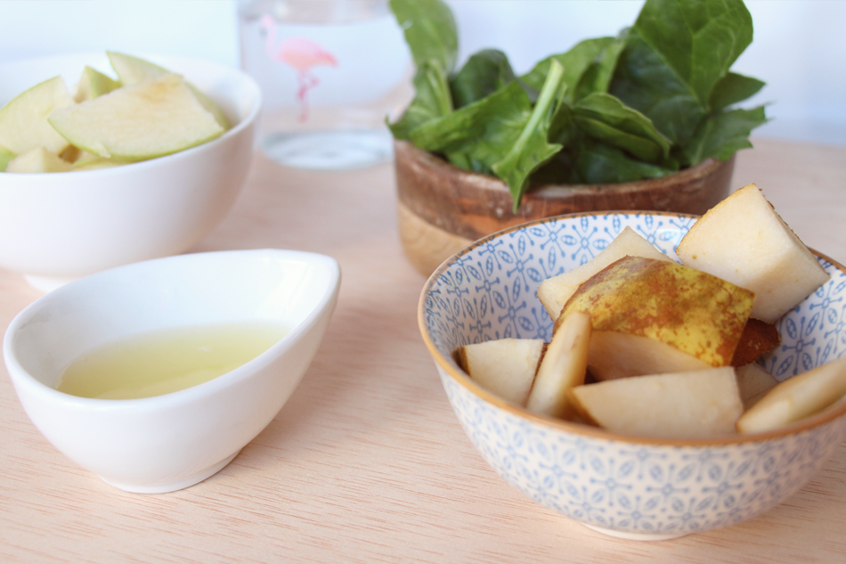 Es un smoothie lleno de vitaminas, que especialmente encontramos en la piel de la manzana y la pera. Recomiendo ponerlas con piel (¡pero lavándolas muy bien!) ya que tienen muchos nutrientes y fibra. Las espinacas, además, son una gran fuente de vitamina K, que ayuda a fortalecer los huesos. Es un batido muy recomendable para tomar de buena mañana y empezar el día ¡con fuerza y energía!