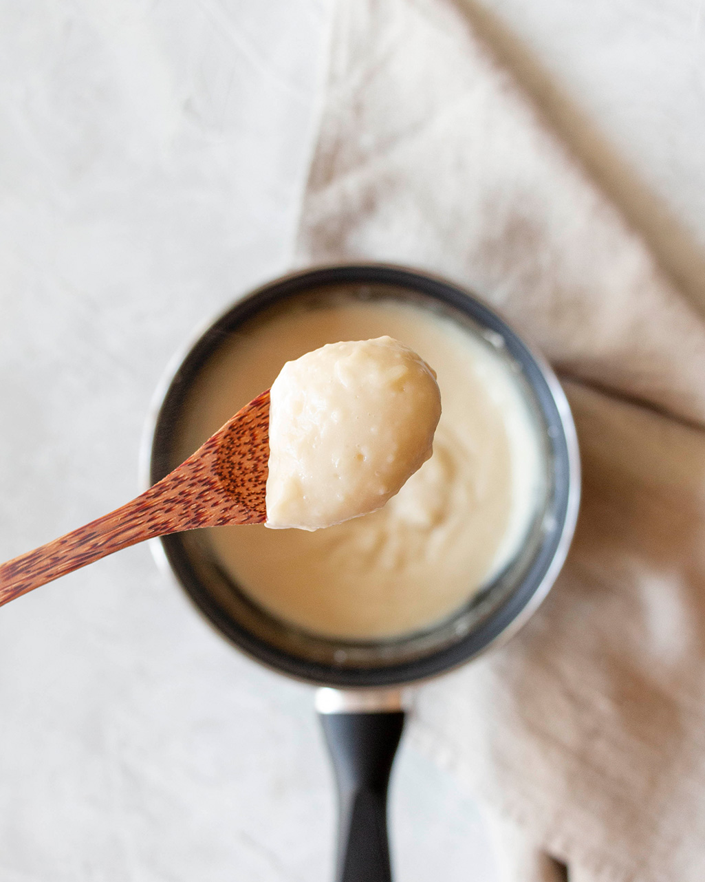 Seguiremos con el flan. Para ello simplemente tendremos que poner todos los ingredientes listados en un cazo, llevarlos a fuego medio-alto y, sin dejar de remover, esperaremos hasta que espese. Más arriba os he dejado una foto de la consistencia.