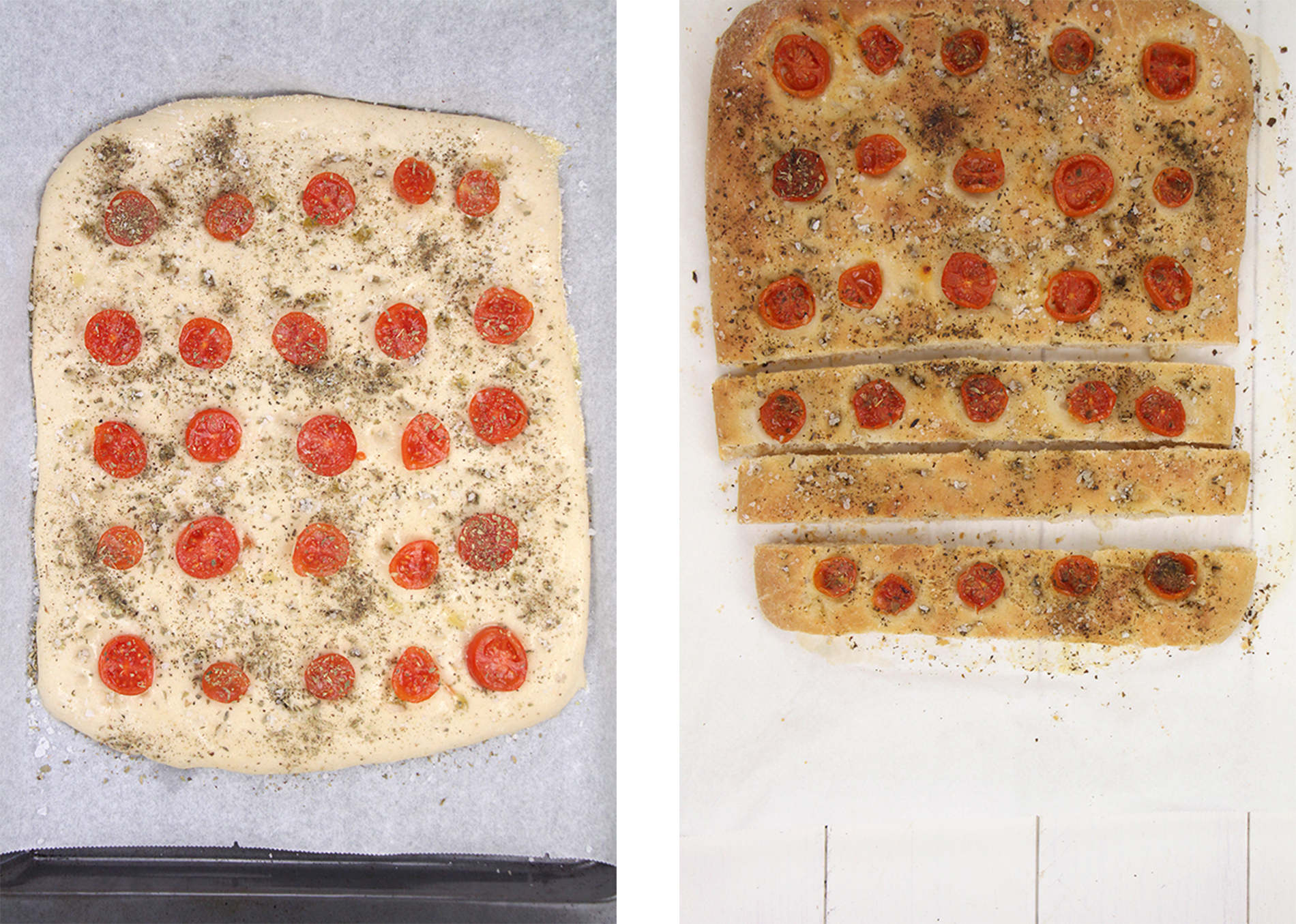 La focaccia tradicional italiana es blanda y ligeramente crocante en la superficie externa. El secreto de este equilibrio perfecto es el aceite de oliva extra virgen y el cariño en el amasado. Y aunque hoy en día cada región en Italia conserva celosamente su receta de focaccia tradicional, nunca puede faltar el denominado «oro líquido»: el aceite de oliva extra virgen. Hoy prepararemos una focaccia con tomatitos cherry, yo querría haberle puesto más pero no me había dado cuenta que casi no me quedaban, así que los repartí como pude por encima de la masa. En cualquier caso, la focaccia sin nada está increíble, así que ¡nada de qué preocuparse!