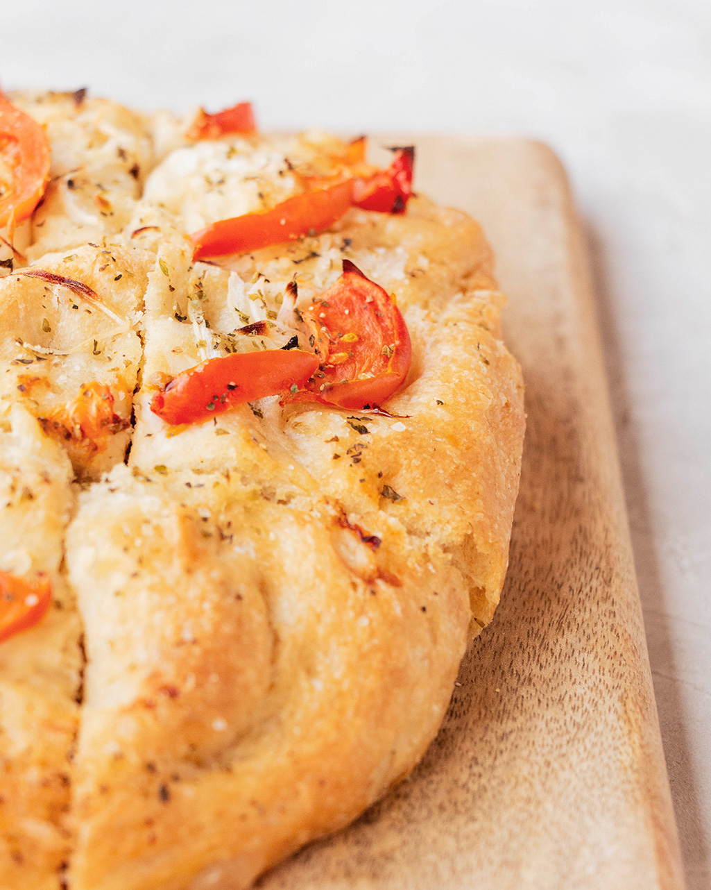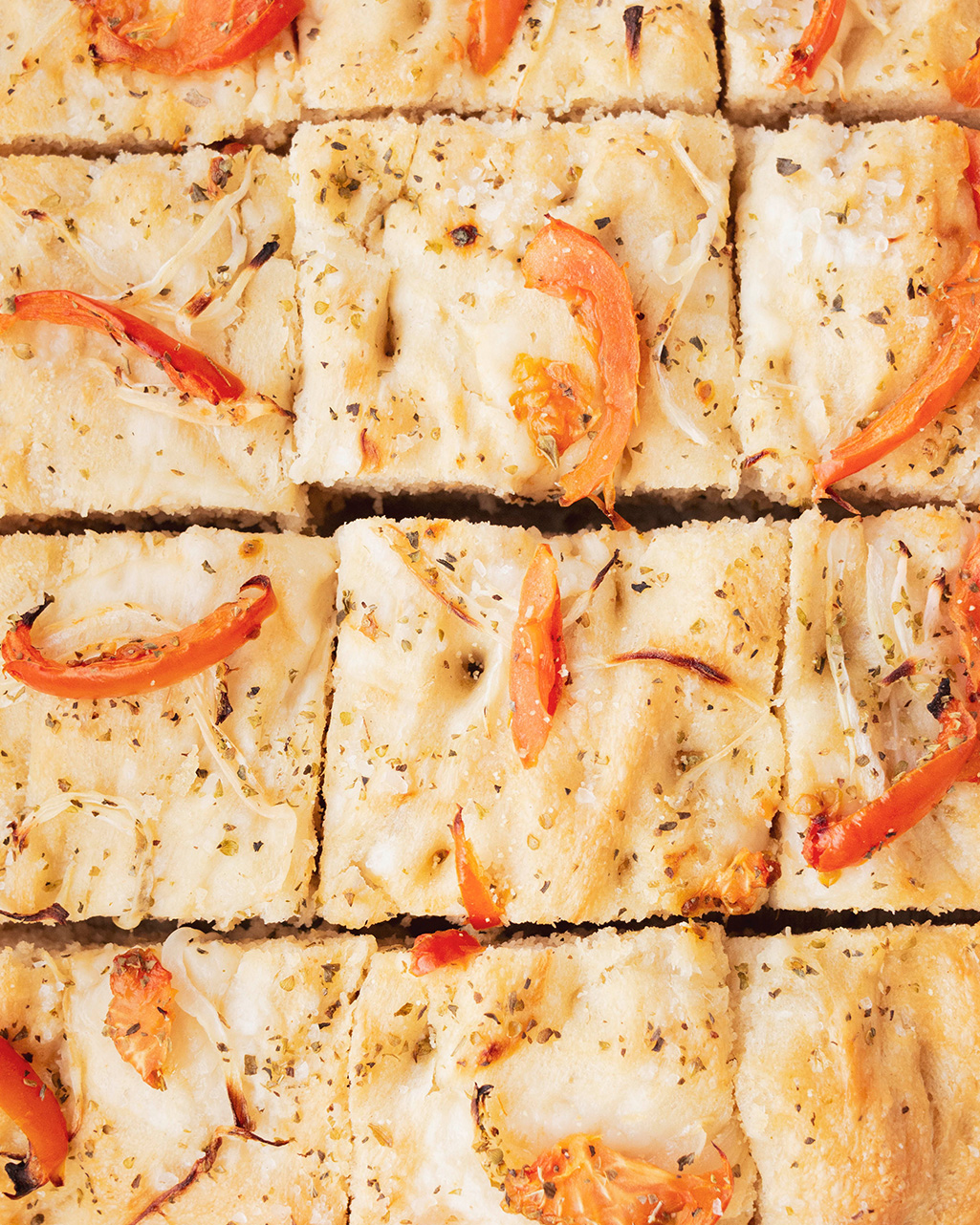 Super crujiente por fuera y tierna por dentro, con un aspecto rústico, perfecta para comer como aperitivo o acompañando cualquiera de las comidas del día. Se puede comer tal cual o añadir otros ingredientes encima o en medio. Lo mismo que los toppings: podéis solo ponerle aceite de oliva y dejarla «desnuda» o añadir variedad de especias (el romero, la albahaca y orégano frescos le quedan genial), sal gorda (para mí un infalible en las focaccias), vaiedad de verduras,… Y por supuesto aceite de oliva, el rey de las focaccias.