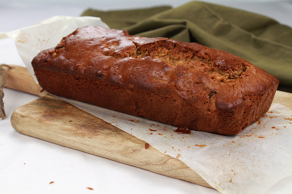 Verteremos la mezcla en un molde de plum cake previamente engrasado y alisaremos la superficie. Después lo llevaremos al horno, pre-calentado a 180ºC, durante unos 50 min. Al introducirlo, pondremos una bandeja en la parte superior o taparemos la tarta con papel de aluminio, para que no se queme la superficie y se cueza por dentro. Cuando hayan pasado 2/3 partes del tiempo de cocinado, entonces podremos retirar la bandeja o papel de aluminio para que acabe de cocerse la superficie y se tueste ligeramente. Cuando pinchemos y el palillo salga limpio, lo podremos sacar del horno.