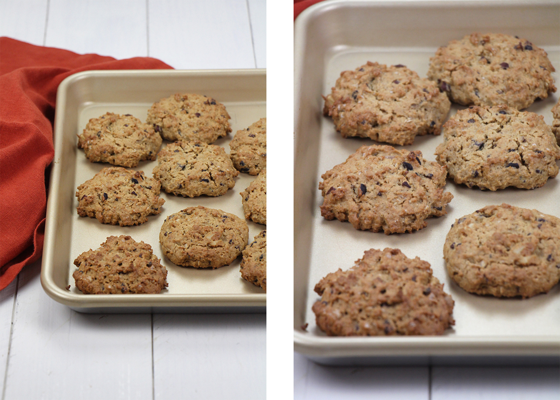 Hornearemos las galletas, con el horno pre-calentado a 180ºC, durante unos 15 min o hasta que veamos que los bordes empiezan a dorarse. Cuando estén listas, las dejaremos reposar 5 min en la misma bandeja para que no se nos rompan y luego las trasladaremos a una rejilla para que enfríen por completo.