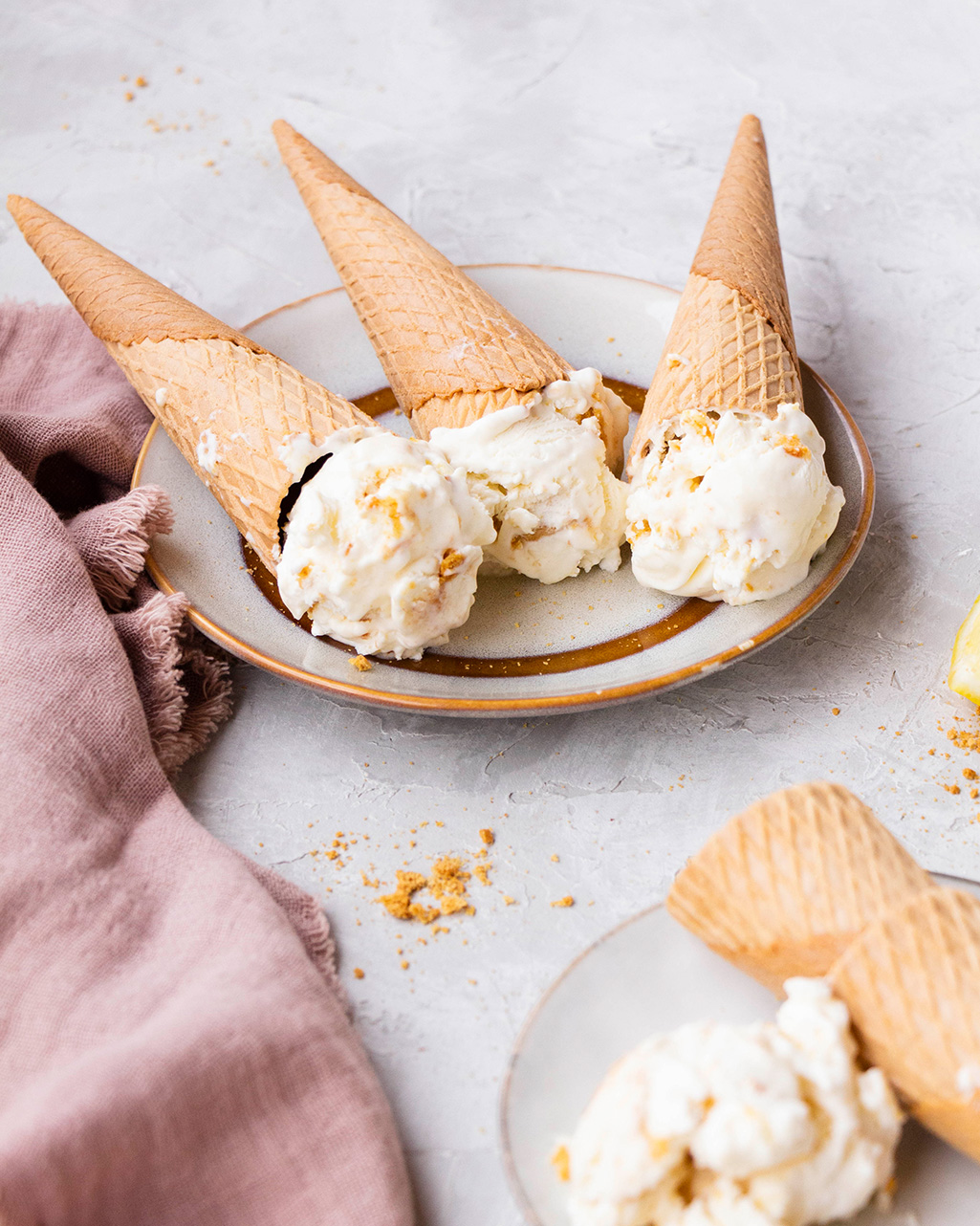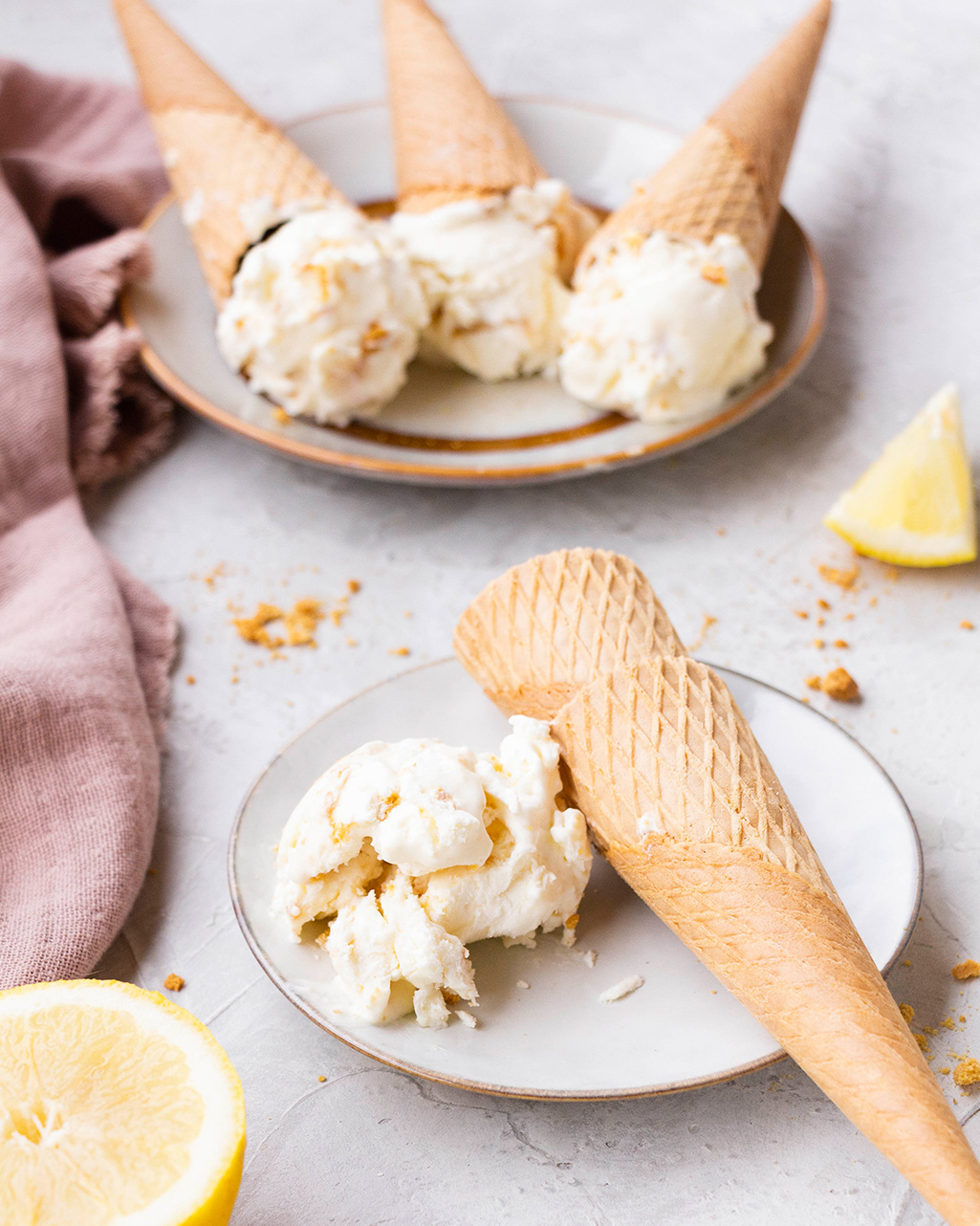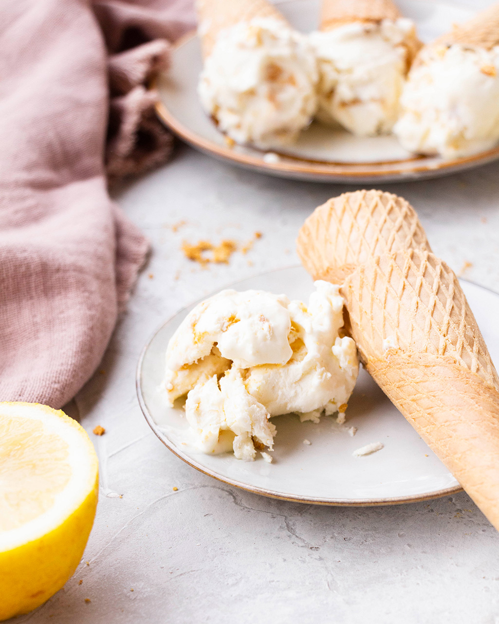 Es un helado suave y cremoso, con un toque refrescante gracias al limón. De hecho, si queréis darle un extra de frescor podéis usar lima o combinación de lima y limón, incluso rallarle la piel, quedaría genial también. Además, le añadimos un punto crocante con las galletas picadas, para recordar a la base de toda tarta de queso. Y ya, para rizar el rizo, lo servimos sobre un cono. Queda increíble, de verdad.