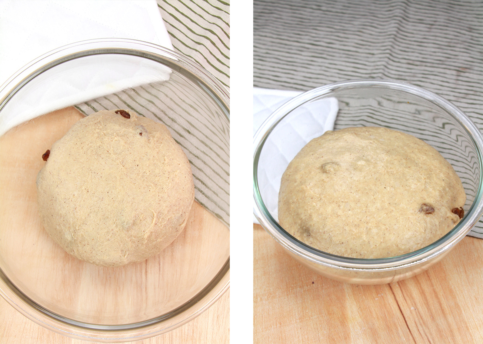 Cuando hayamos conseguido el punto deseado, estiraremos un poco la masa con las manos y le añadiremos las pasas. Amasaremos 1 min más para que se integren y repartan por toda la masa y formaremos una bola. La colocaremos en un bol grande aceitado (ponemos unas gotitas de aceite en un papel de cocina y «pintamos» todo el bol») y la taparemos para que fermente. Podemos taparla con la tapa del bol (si la tiene), un trapo o papel film. Lo dejaremos reposar alrededor de 2 horas o hasta que duplique su tamaño. Os recomiendo que la dejéis en un espacio caliente y sin corrientes de aire, ya que así favoreceremos el levado de la masa.