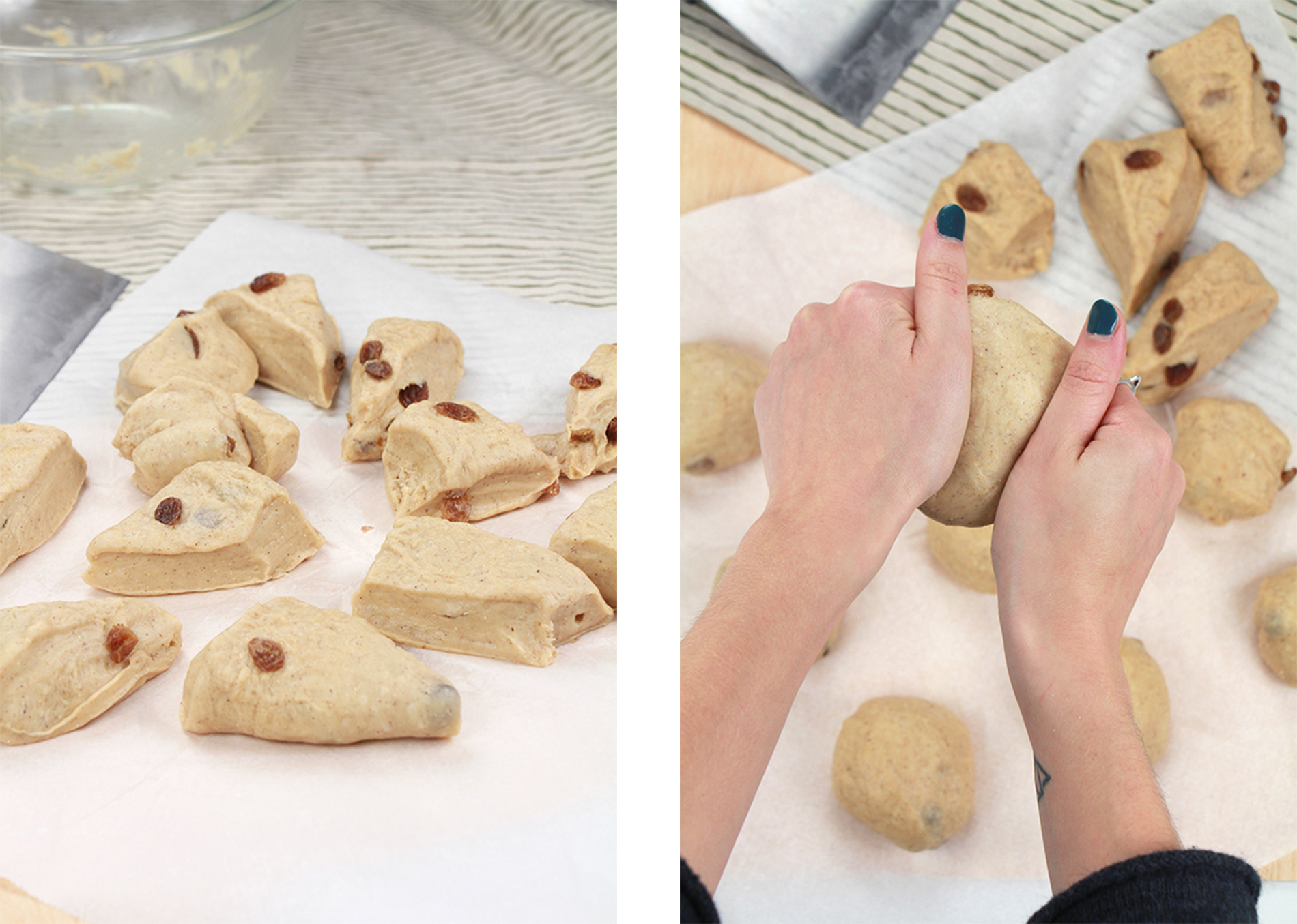 Pasado el tiempo de levado, volcaremos la masa fermentada sobre la superficie de trabajo y la amasaremos un par de minutos para desgasificarla y volver al tamaño original. Entonces, con la ayuda de una rasqueta o cortador de metal, incluso un cuchillo muy afilado, cortaremos la masa en 10 o 12 porciones, dependiendo del tamaño de bollo que deseéis hacer. Debemos intentar que sean lo más parecidas posible, así que os recomiendo estirar la masa en forma de rulo gordo y cortar «rebanadas» del mismo grosor, así podréis igualar mejor los tamaños.