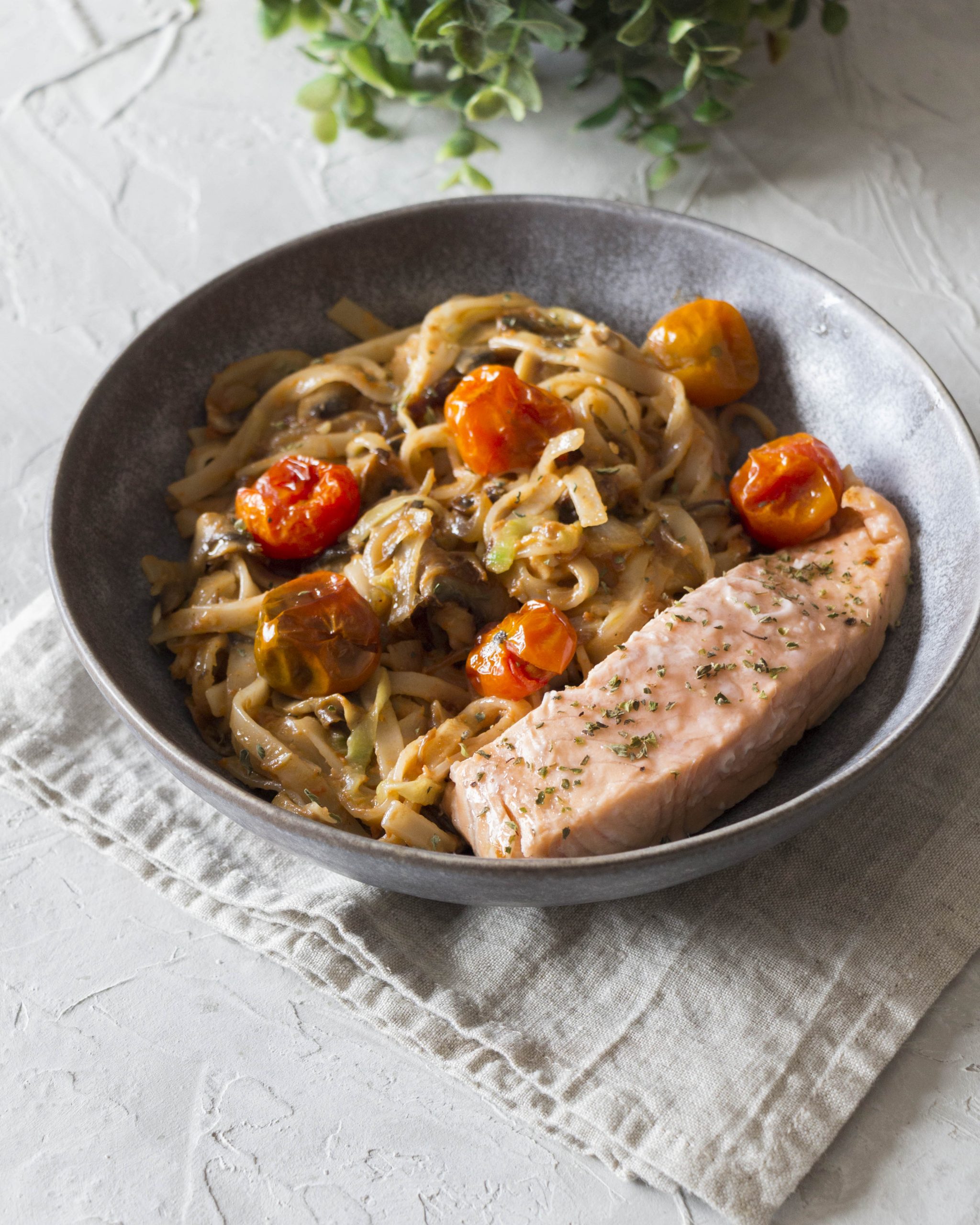 Fideos de calabacín y arroz con sofrito de cebolla y cherrys + Salmón al horno con limón