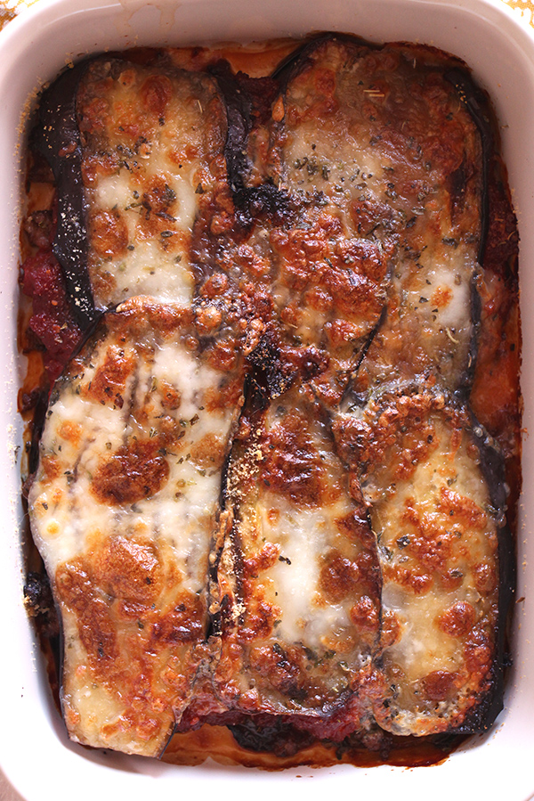 Cuando tengamos la última capa de berenjena, cortaremos la mozzarella en láminas y la repartiremos por toda la superficie, intentando casi cubrirla. No os preocupéis si no cubre todo, cuando se derrita ya se expandirá. Volveremos a espolvorear un poco de parmesano y nos lo llevaremos al horno, en modo gratinar, durante unos 5-10 min o hasta que se dore.