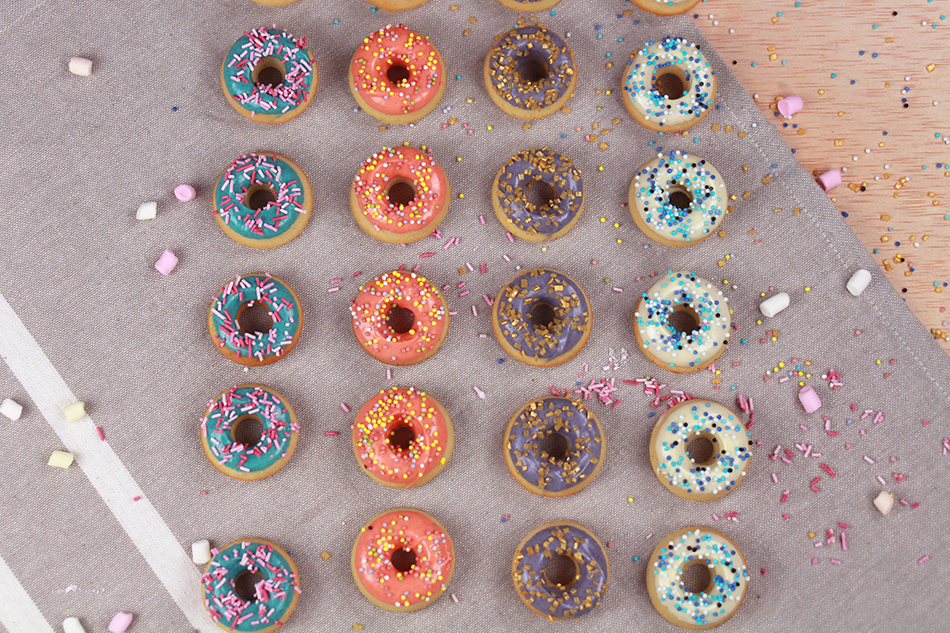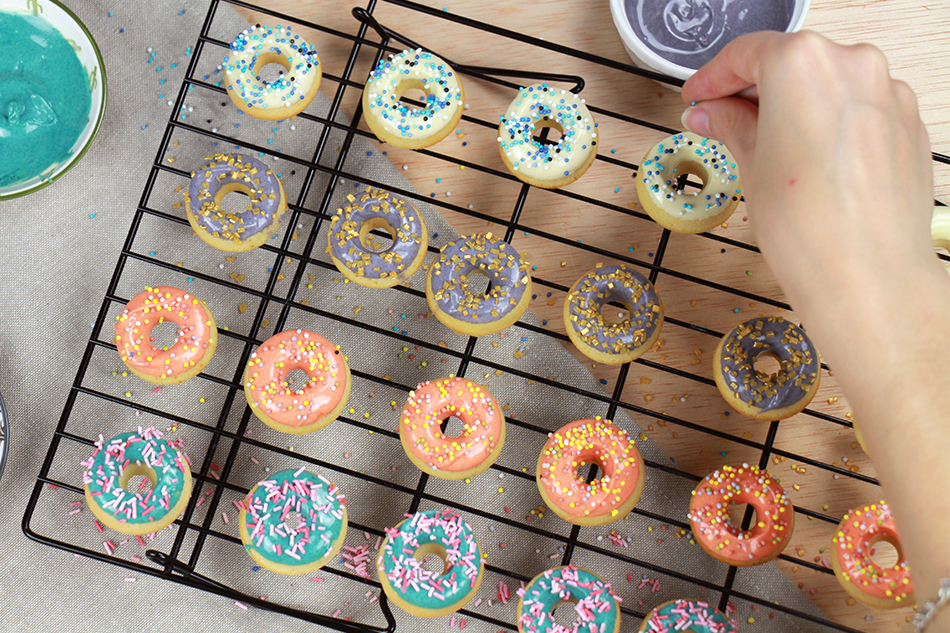 Cuando tengamos todos los donuts teñidos, espolvorearemos los sprinkles por encima. Yo elegí un tipo diferente para cada color, pero podéis hacerlo como más os guste.