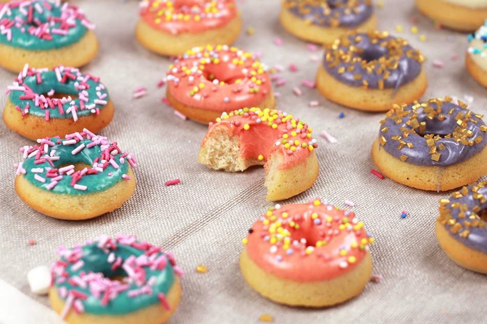 Estos mini donuts pueden comerse tal cual, los vamos a decorar con una cobertura de chocolate teñido. Son perfectos para mesas dulces o celebraciones, porque son muy vistosos y son sencillos de comer, en un bocado los devoramos. Pero también podríais usar un molde de donuts grande y os saldrían menos unidades.