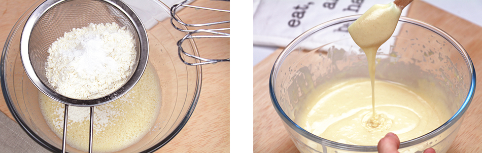 Tamizamos la harina con la levadura y lo batimos de nuevo (primero a baja velocidad para que no vuele, después a velocidad alta), hasta conseguir una masa ligera.