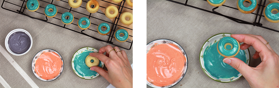 Cogeremos un donut, lo sumergiremos hasta la mitad en el chocolate de color deseado y le daremos enérgicamente la vuelta. Después lo volveremos a llevar a la rejilla. Lo repetiremos para los varios donuts y colores.