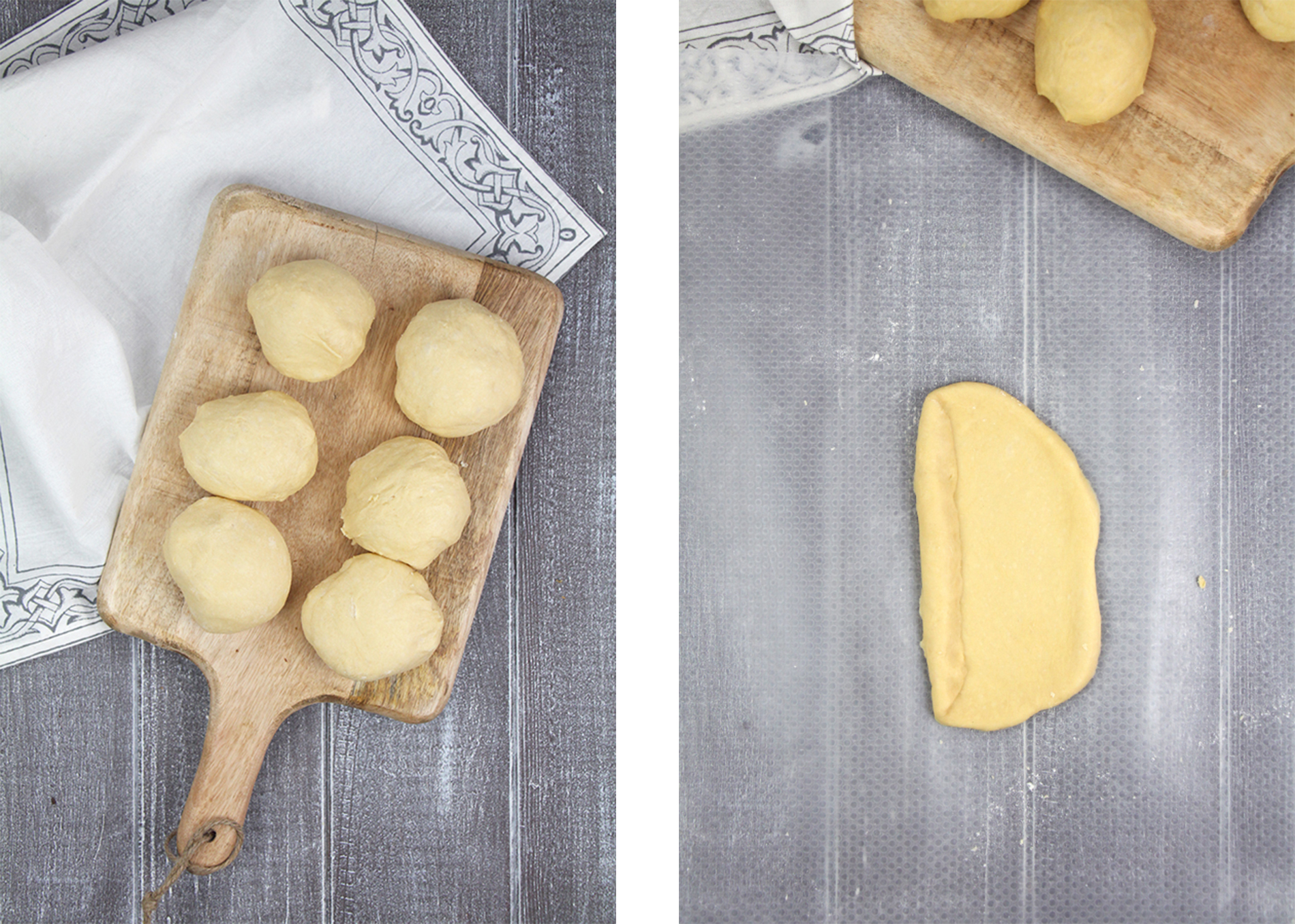 Seguiremos así con todos los bollos y los iremos colocando sobre una bandeja engrasada o con un papel vegetal, separados unos 2 o 3 dedos entre ellos. También iremos tapando los panes hechos con un trapo para que no se sequen.
