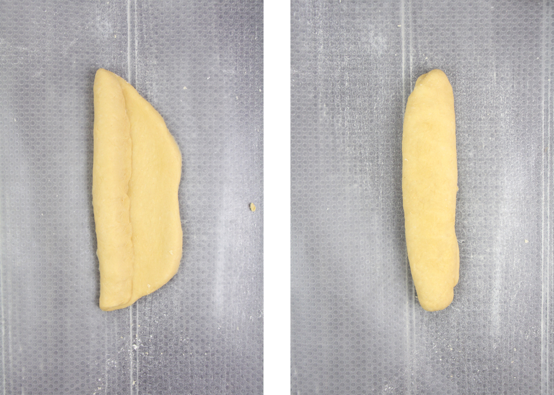 Entones empezaremos a enrollar el lado más largo y cada vez que hagamos una «vuelta» presionaremos bien el rollo con la base con las yemas de los dedos para así ir incorporando aire al pan y que así nos quede bien esponjoso y blandito. Seguiremos así hasta enrollar todo el bollo y presionaremos también el borde final con el bollo. Rodaremos un poco el rollo sobre la encimera para asentar y lo chafaremos un poco para que no quede demasiado delgado.