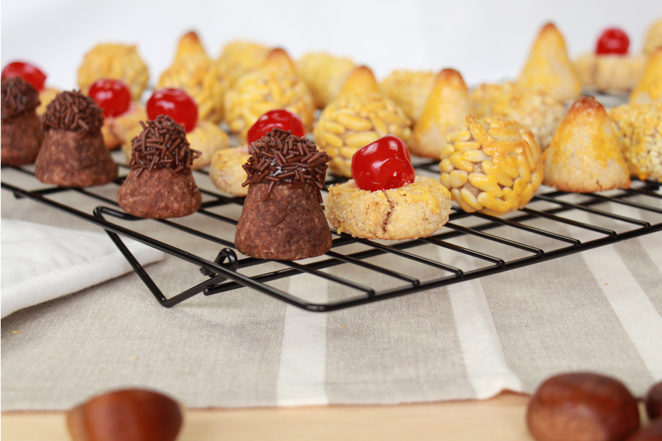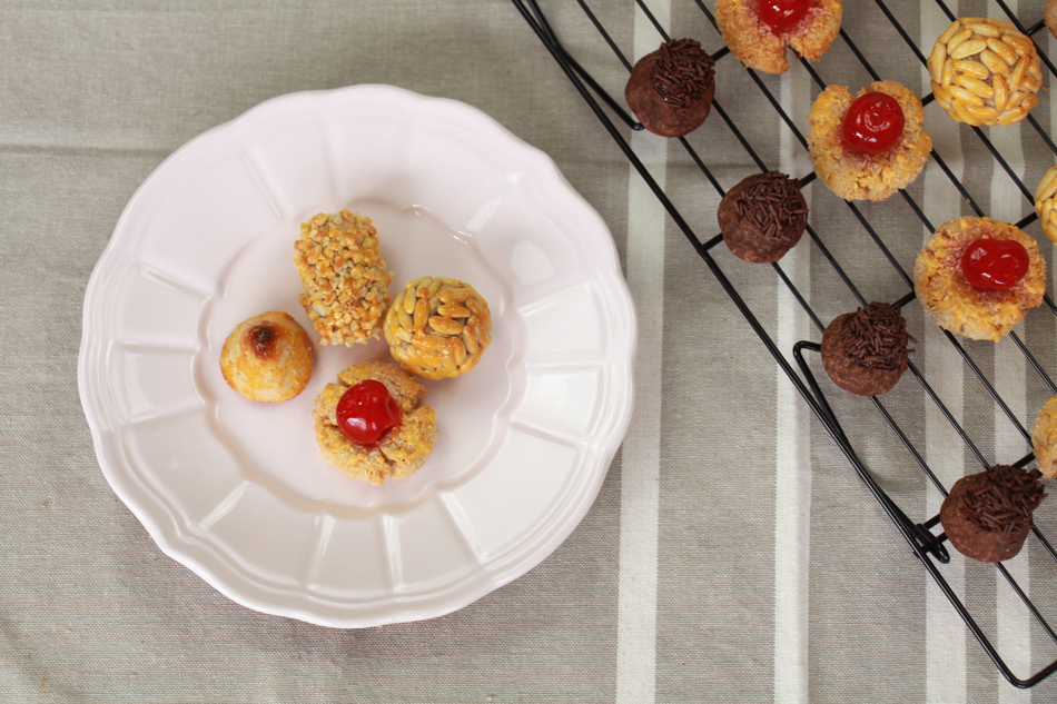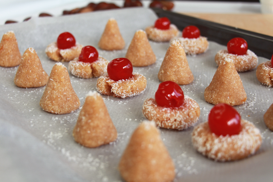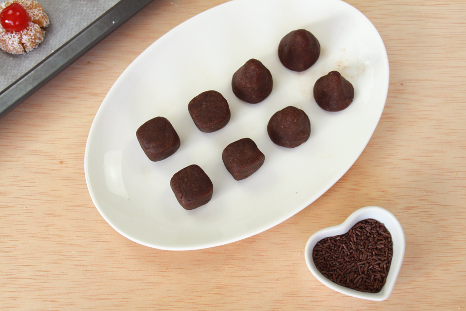 Creamos las formas para los panellets de coco y chocolate y los colocamos de nuevo en una bandeja de horno con papel vegetal o en un recipiente de cristal, pero que sea diferente de la de los panellets de piñones y almendra, ya que estos tardan más en hacerse y hay que ponerlos en diferentes horneadas. Por lo que respecta a las formas, para los de coco, yo suelo utilizar o una forma de cono, para poder requemarles la punta, y una mas redondita con un hueco en el medio, para poner una cereza sobre el mismo. Para los de chocolate podemos hacer bolas lisas o hacerle alguna forma y recubrirlos de sprinkles de chocolate. Yo suelo hacer cubitos y conitos que, tras el horneado, recubro la parte a decorar con chocolate negro derretido, para que las virutas se enganchen fácilmente. Son solo consejos, ¡utiliza tu ingenio!