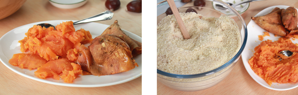 Con un tenedor chafamos bien el boniato y lo agregamos en un bol con la almendra molida, el azúcar, el azúcar avainillado, la canela.