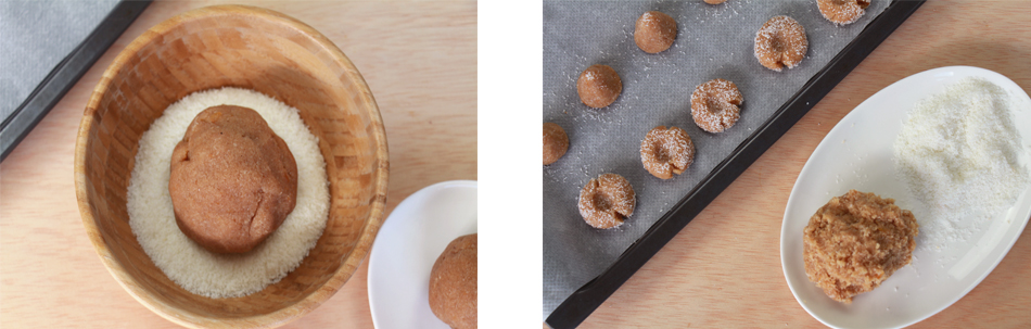 Para hacer los panellets de coco y chocolate hay que seguir el mismo proceso, pero con bolas de masa diferentes. Así pues, para los de coco, se coge la bola que habíamos reservado para estos panellets, le vertimos todo el coco o cacao y amasamos hasta que se integre como al principio de la receta. Siempre debería haber más coco y cacao que masa, pero al final es una cuestión de gustos. Podemos ir probando hasta que consideremos que nos encanta el sabor 😉